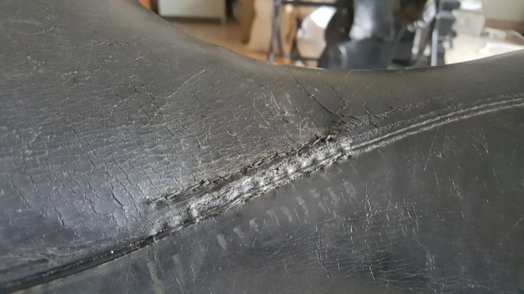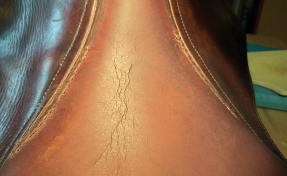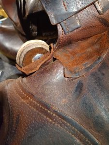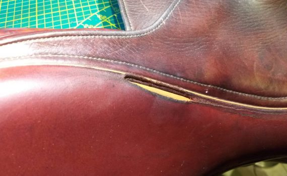 Eerst werd de onderkant verstevigd, daarna de voorkant op een passende manier hersteld. Uiteraard werd de andere kant op dezelfde manier verschoond. De 2 scheuren nog hersteld en het zadel kan er weer even tegen.