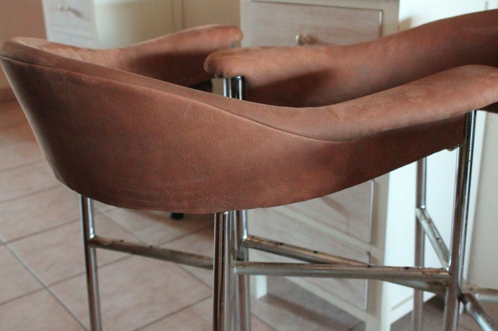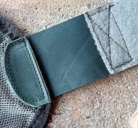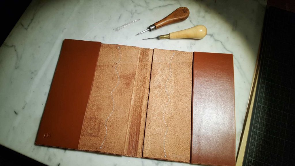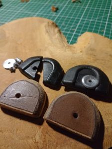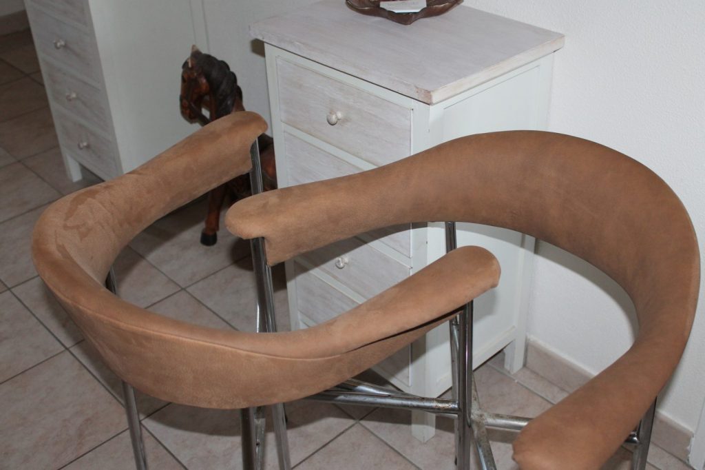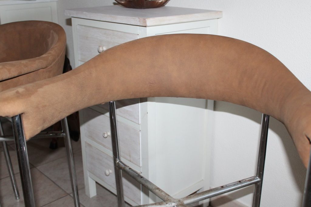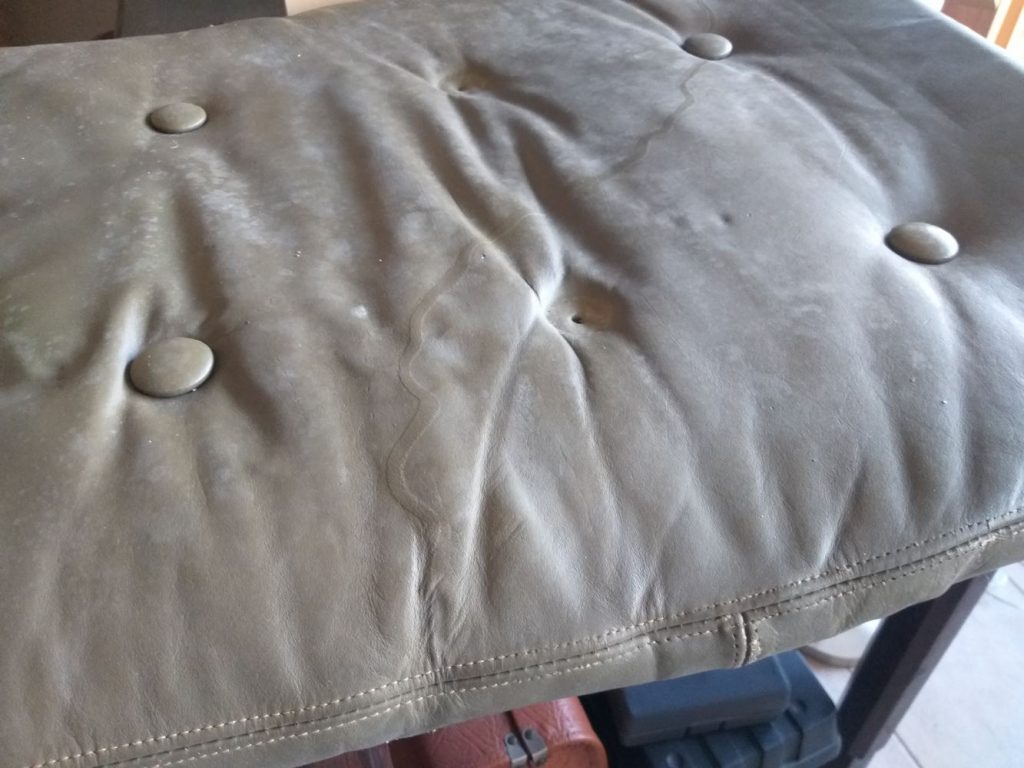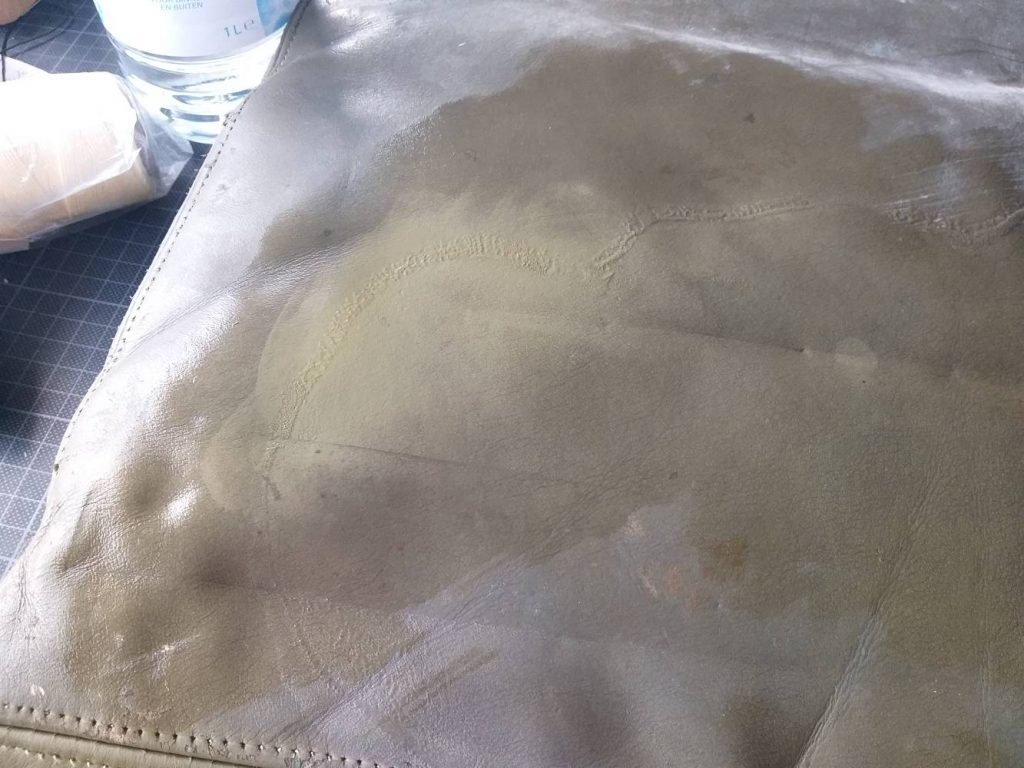 Eerst werd het materiaal van de net gekochte zetels geprobeerd (om te matchen), maar dat gaf een ongewenst resultaat – zie eerste foto. Een opgeruwd rundsleer deed dan wel de job en gaf een mooi glad resultaat.